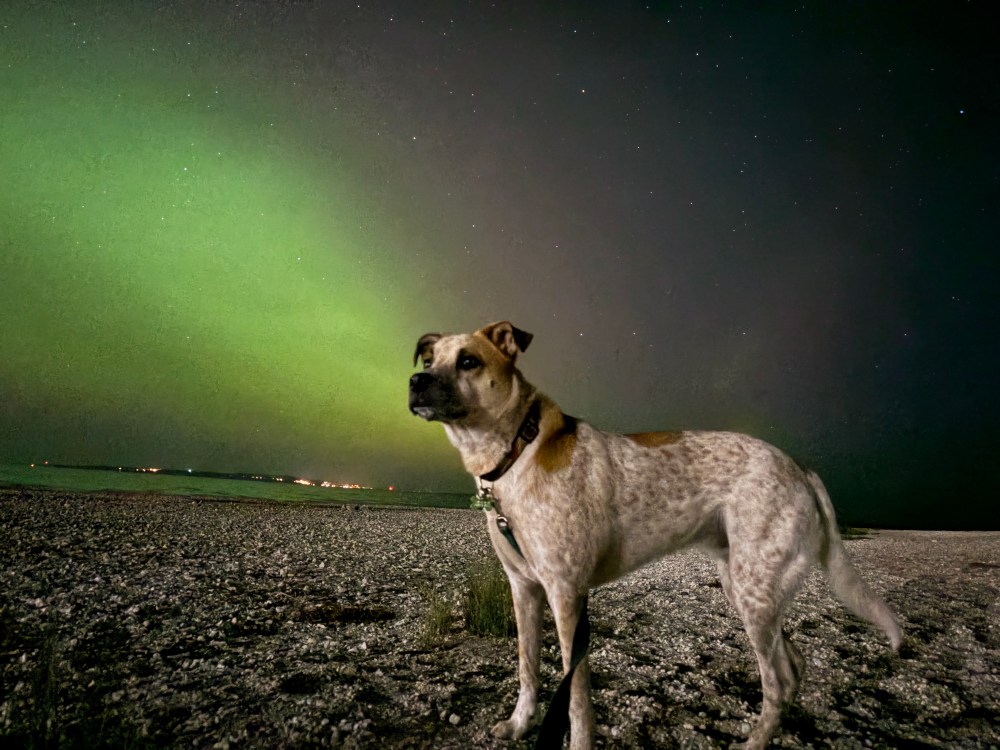 Elio, the Sun Dog, in the Sunset. Playing fetch on a perfect evening, after a perfect three-day streak of catching the Aurora at the 42nd Parallel right in my backyard. Oh, I am so fortunate. It’s going to be a great season!